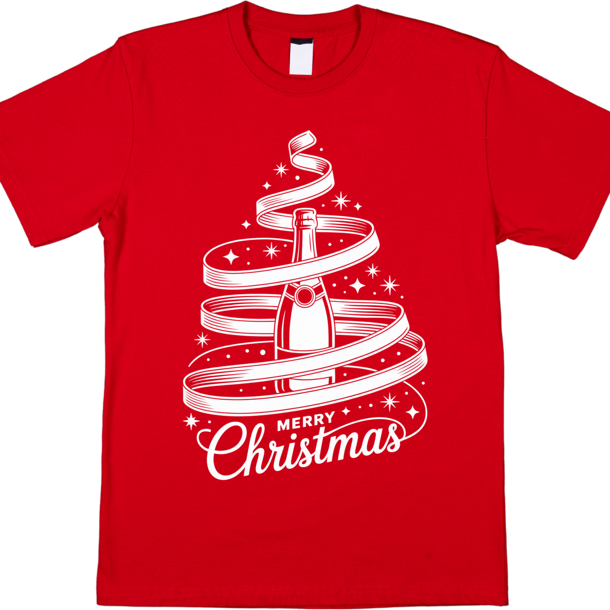 Celebrate in style with this festive “Merry Christmas” tee featuring a ribbon-wrapped champagne bottle shaped like a holiday tree. Perfect for parties, photos, and anyone who loves a little sparkle with their Christmas cheer.