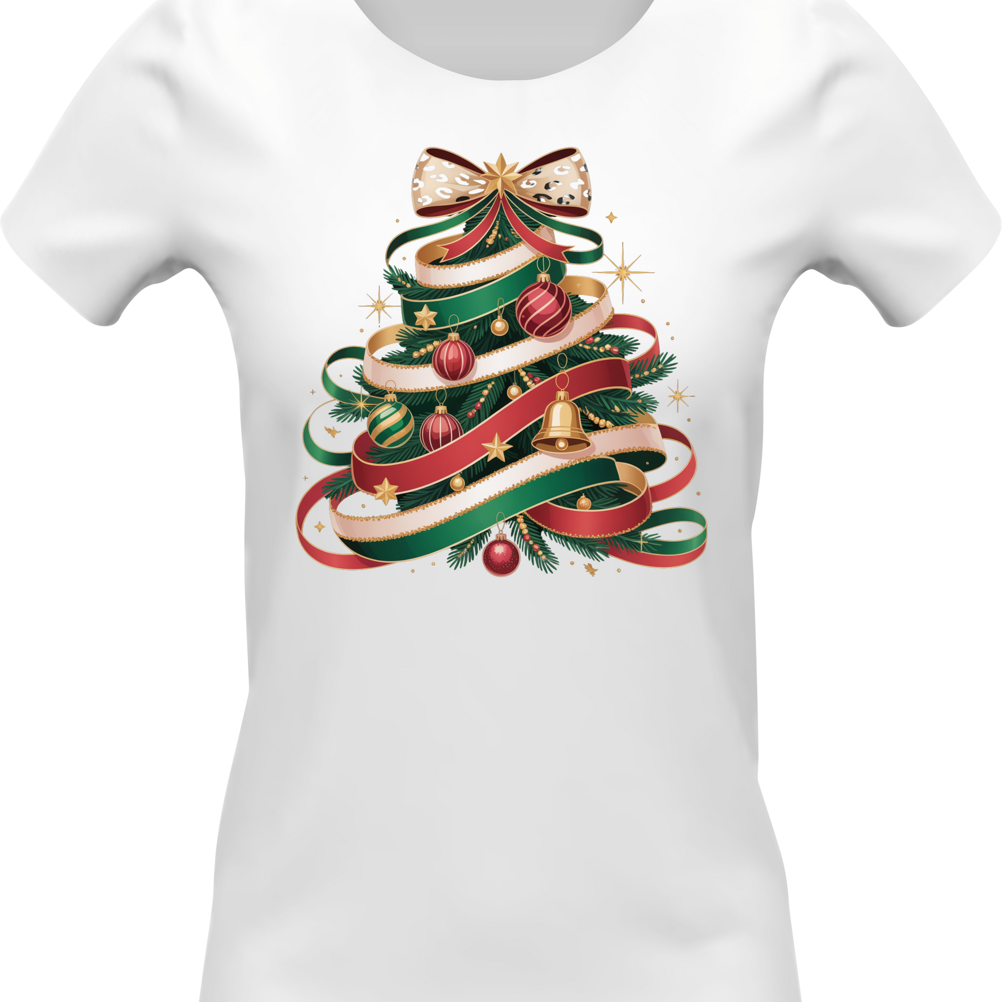 Turn heads this holiday season with this elegant ribbon-swirl Christmas tree tee. Designed with rich festive colors, ornaments, gold accents, and a stylish bow topper, it’s the perfect blend of classy and Christmas cheer.